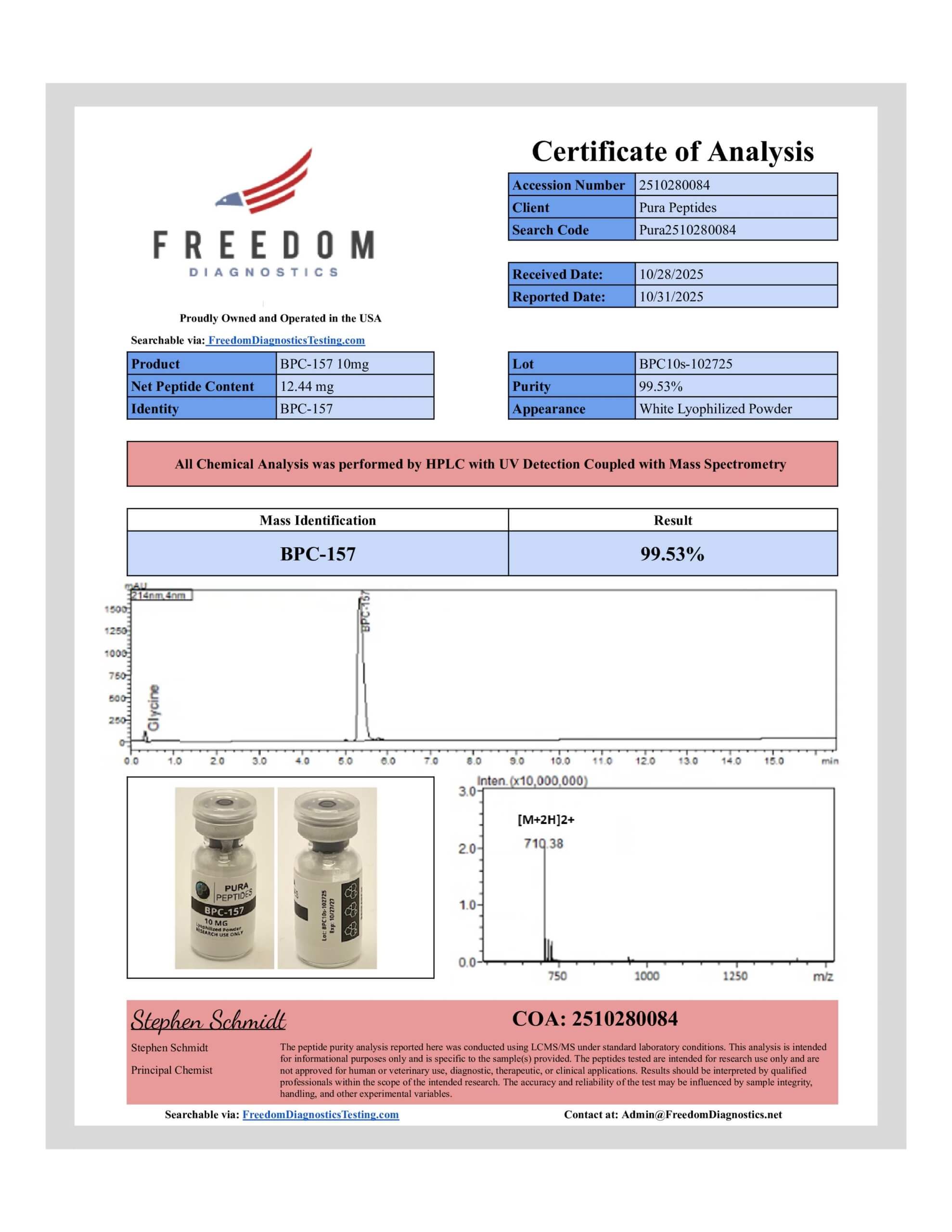 Important Notice: The research product is supplied in a 3 mL vial containing 10 mg of BPC-157 as a lyophilized powder.